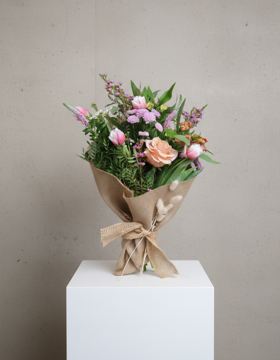 Spring bouquet wrapped in rustic hessian that speaks volumes. Soft pastel tulips mingle with delicate wax flowers and roses, creating a harmonious blend of seasonal blooms that radiates elegance and care. This thoughtfully designed arrangement captures the gentle beauty of spring. Hand-wrapped with attention to detail, Lucie delivers both visual charm and lasting freshness that transforms any space into a garden of joy.